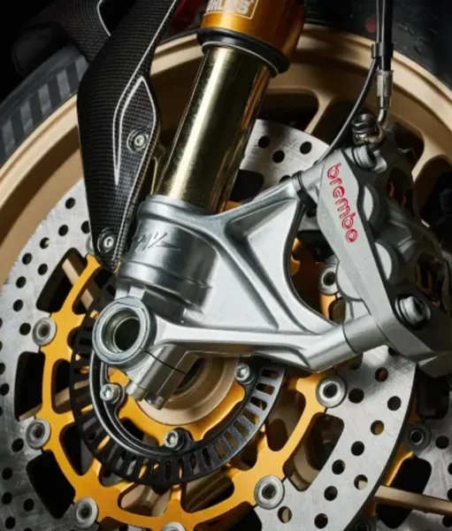 The chassis setup reinforces that performance focus. A steel trellis frame, single-sided swingarm, and lightweight forged wheels keep the bike agile, while fully adjustable Öhlins suspension ensures precise control whether pushing hard on twisty roads or cruising at a relaxed pace. Braking is handled by Brembo Hypure calipers, paired with Pirelli Diablo Rosso IV tyres, delivering excellent grip and stopping power.