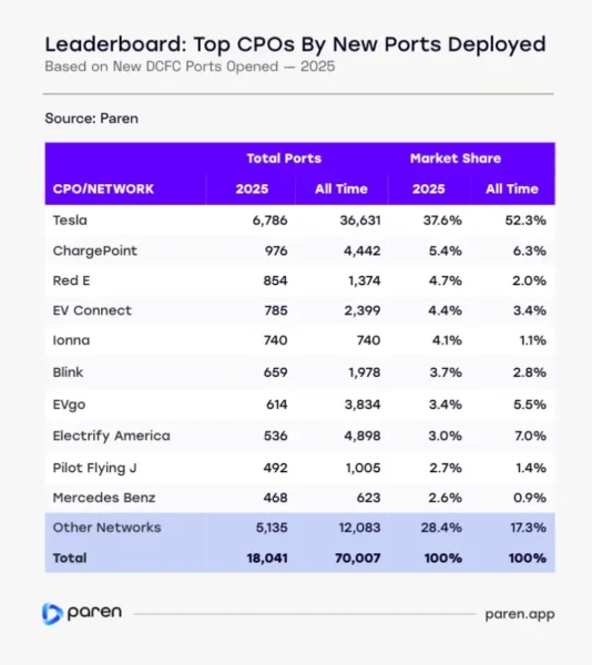 The growth also reshaped the competitive landscape. Tesla remained the single largest player, adding nearly 6,800 Supercharger ports. But its share of new deployments fell below 40% as the broader ecosystem expanded even faster. New and OEM-backed networks scaled rapidly, while dozens of smaller operators collectively doubled their contribution year over year.