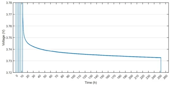 At first glance, the number appears promising, but the details reveal a more complex picture. Most of the voltage drop occurred immediately after charging — a normal phenomenon known as voltage relaxation rather than actual self-discharge. In fact, the voltage fell by about 60 mV within the first 10 seconds and 103 mV during the first hour. After roughly ten hours, however, the battery’s voltage stabilized, drifting only 12 mV over the remaining 230 hours.